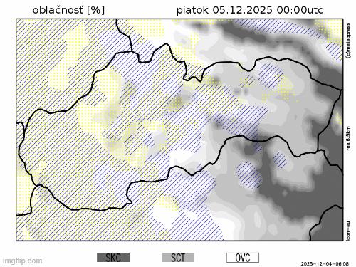 Obr. 2: Predpokladaný vývoj oblačnosti na Slovensku v piatok (5. 12.) podľa modelu ICON-EU