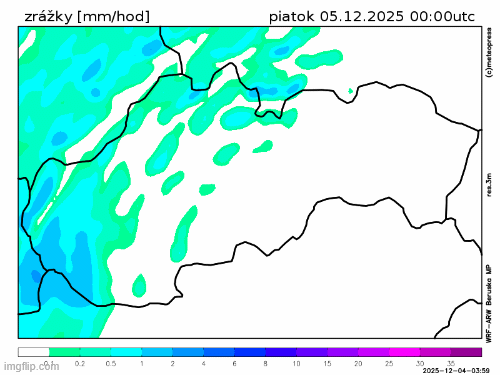 Obr. 3: Predpokladaný vývoj zrážok na Slovensku v piatok (5. 12.) podľa modelu WRF