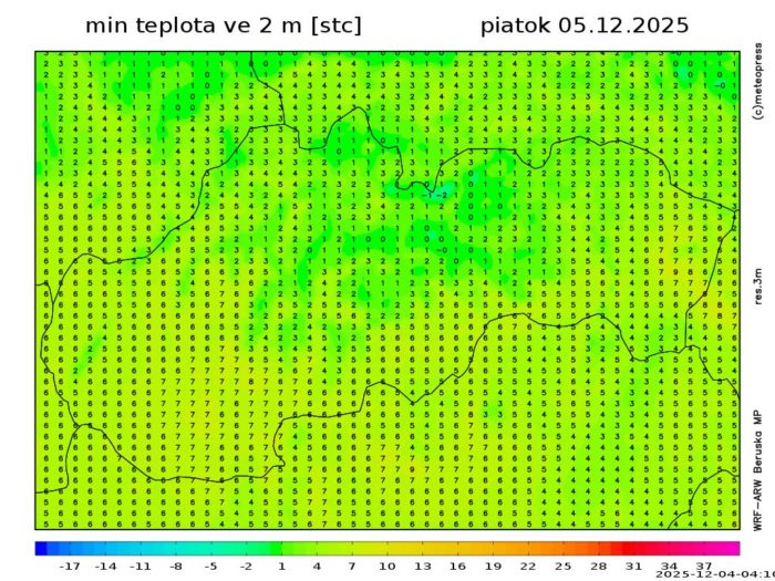 Obr. 4: Predpokladaná minimálna teplota vzduchu v piatok (5. 12.) podľa modelu WRF