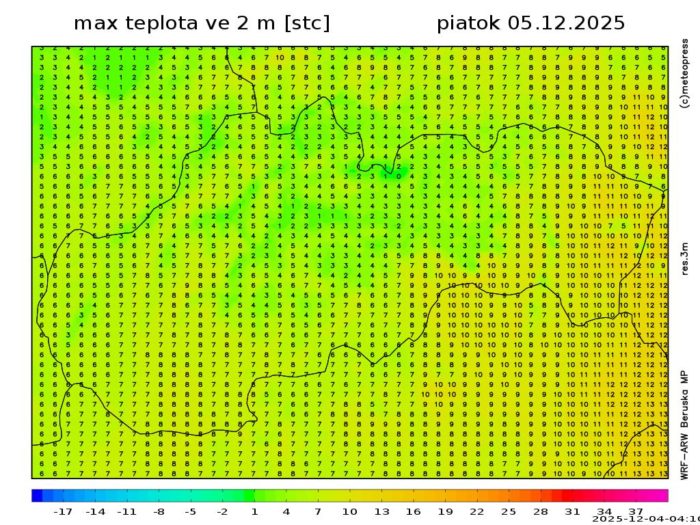 Obr. 5: Predpokladaná maximálna teplota vzduchu v piatok (5. 12.) podľa modelu WRF
